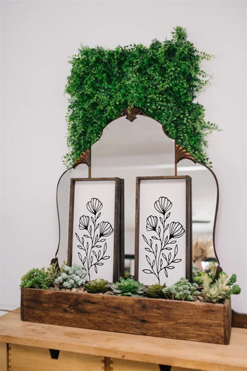 - Design is silk screened onto painted MDF Framed with stained pine wood